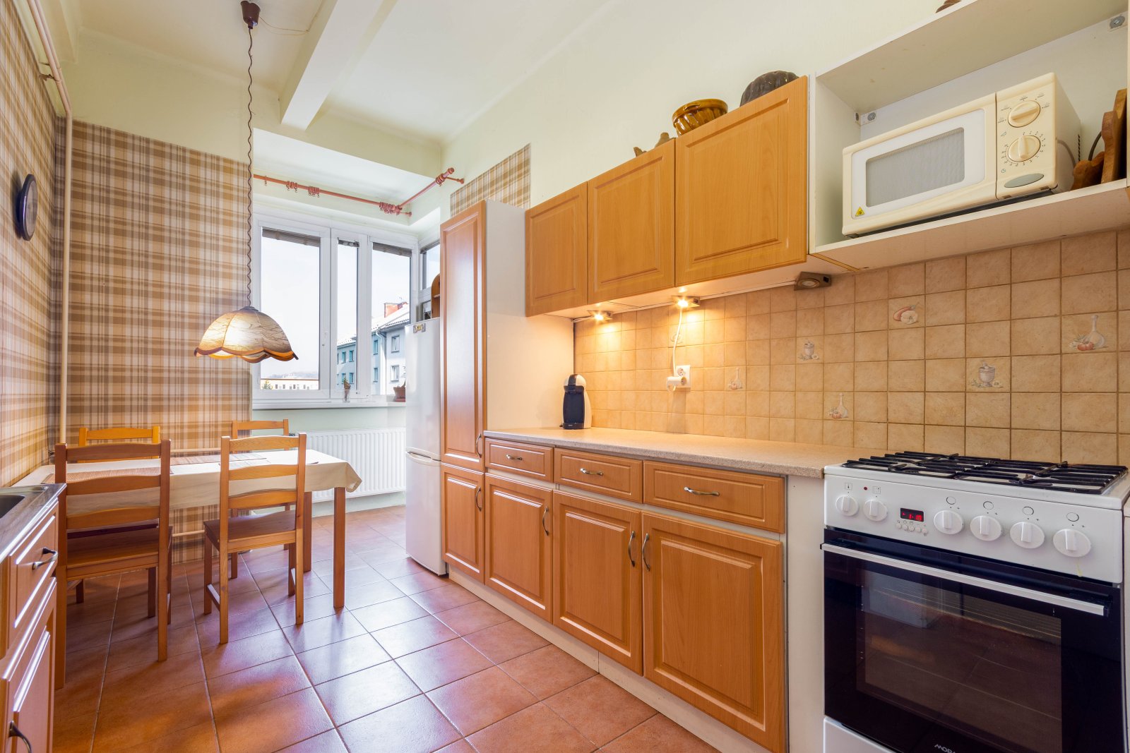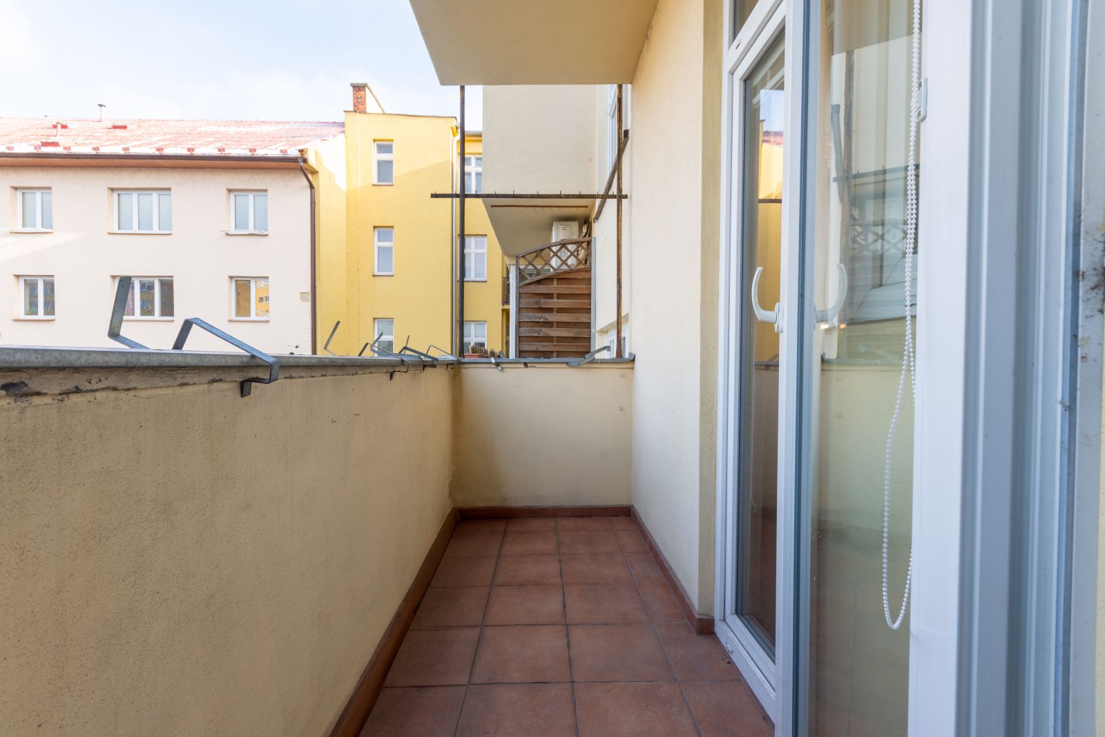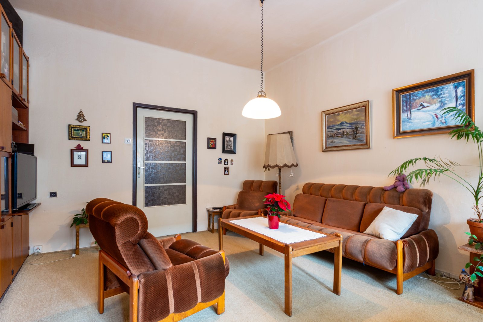 Dispozice bytu je velmi praktická. Po vstupu do bytu vejdeme do prostorné předsíně/haly/ s originálním kazetovým stropem. Z předsíně je samostatný vstup do obývacího pokoje a dětského pokoje s balkonem. Ložnice je dostupná, jak z obývacího pokoje, tak z předsíně. Na předsíň navazuje malá předsíňka, ze které je vstup do koupelny s vanou, do samostatného WC a do kuchyně. Z dětského pokoje a kuchyně se vchází na balkon, který je průchozí a je orientovaný do vnitrobloku. Součástí kuchyně je starší kuch.linka, plyn.sporák a lednice. Z kuchyně je také vstup do komory a spíže. Byt je vytápěný vlastním plynovým kotlem. Stejně je řešen i ohřev vody. Podlahová krytina jsou parkety a na nich koberce. V kuchyni a v koupelně dlažba. V bytě byla provedena výměna oken za plastová a okna do ulice mají elektrické rolety. Před 10 lety proběhla rekonstrukce koupelny včetně rozvodů vody. V domě je rozvod TV a internetu. K bytu náleží velký sklep a komora na patře.