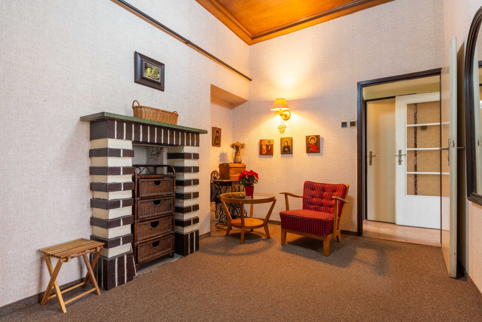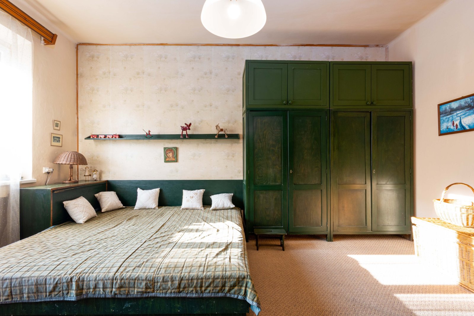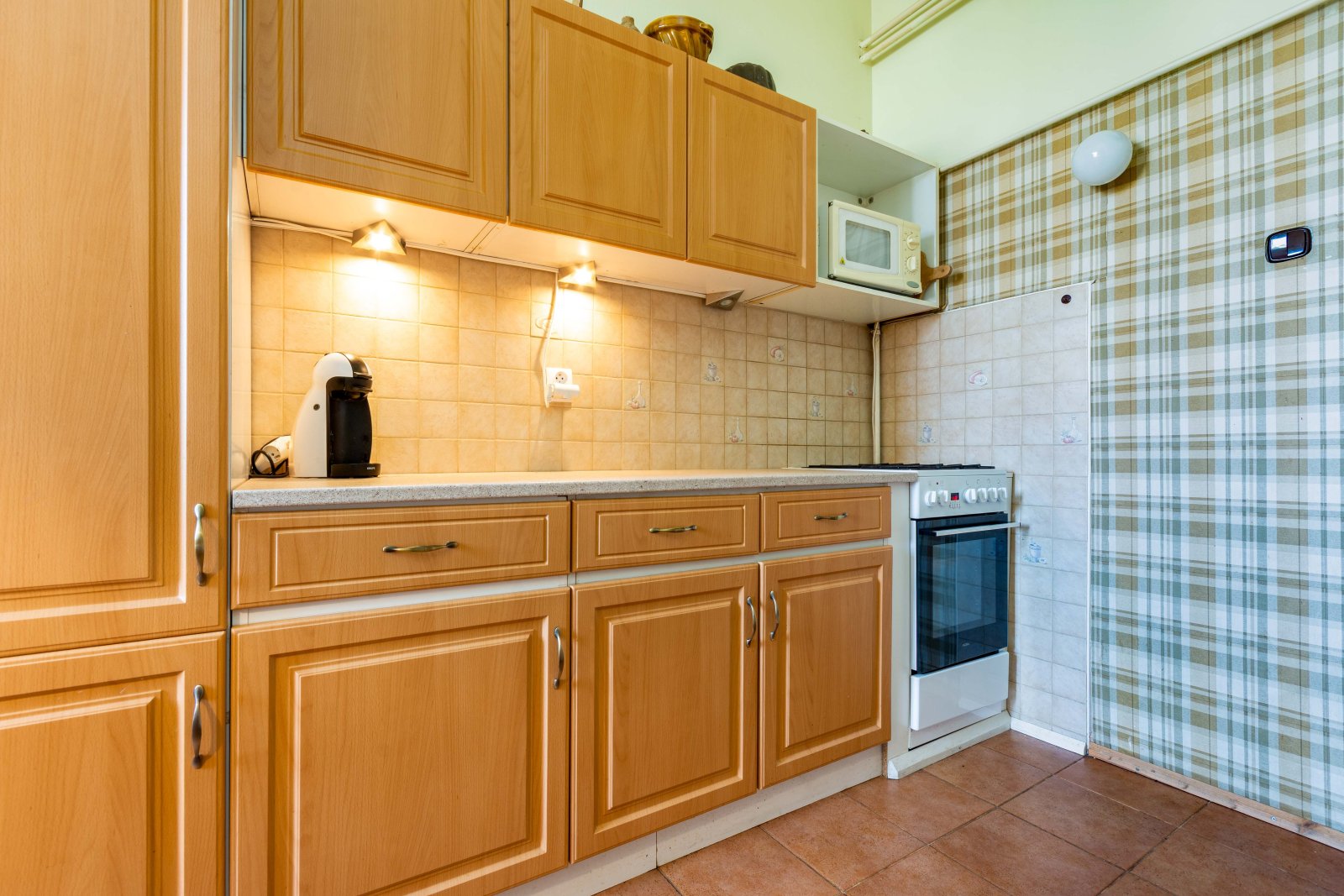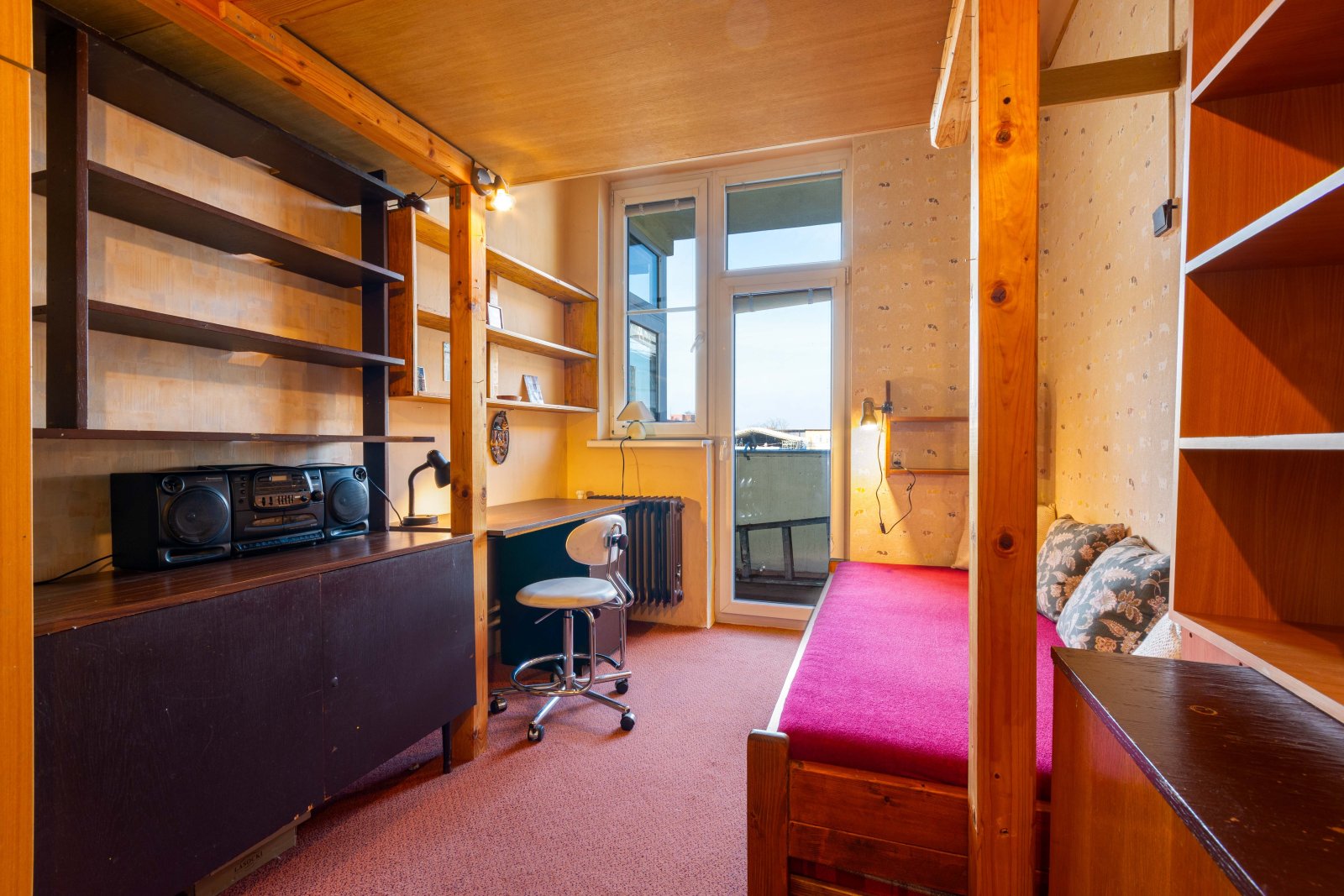 Dispozice bytu je velmi praktická. Po vstupu do bytu vejdeme do prostorné předsíně/haly/ s originálním kazetovým stropem. Z předsíně je samostatný vstup do obývacího pokoje a dětského pokoje s balkonem. Ložnice je dostupná, jak z obývacího pokoje, tak z předsíně. Na předsíň navazuje malá předsíňka, ze které je vstup do koupelny s vanou, do samostatného WC a do kuchyně. Z dětského pokoje a kuchyně se vchází na balkon, který je průchozí a je orientovaný do vnitrobloku. Součástí kuchyně je starší kuch.linka, plyn.sporák a lednice. Z kuchyně je také vstup do komory a spíže. Byt je vytápěný vlastním plynovým kotlem. Stejně je řešen i ohřev vody. Podlahová krytina jsou parkety a na nich koberce. V kuchyni a v koupelně dlažba. V bytě byla provedena výměna oken za plastová a okna do ulice mají elektrické rolety. Před 10 lety proběhla rekonstrukce koupelny včetně rozvodů vody. V domě je rozvod TV a internetu. K bytu náleží velký sklep a komora na patře.