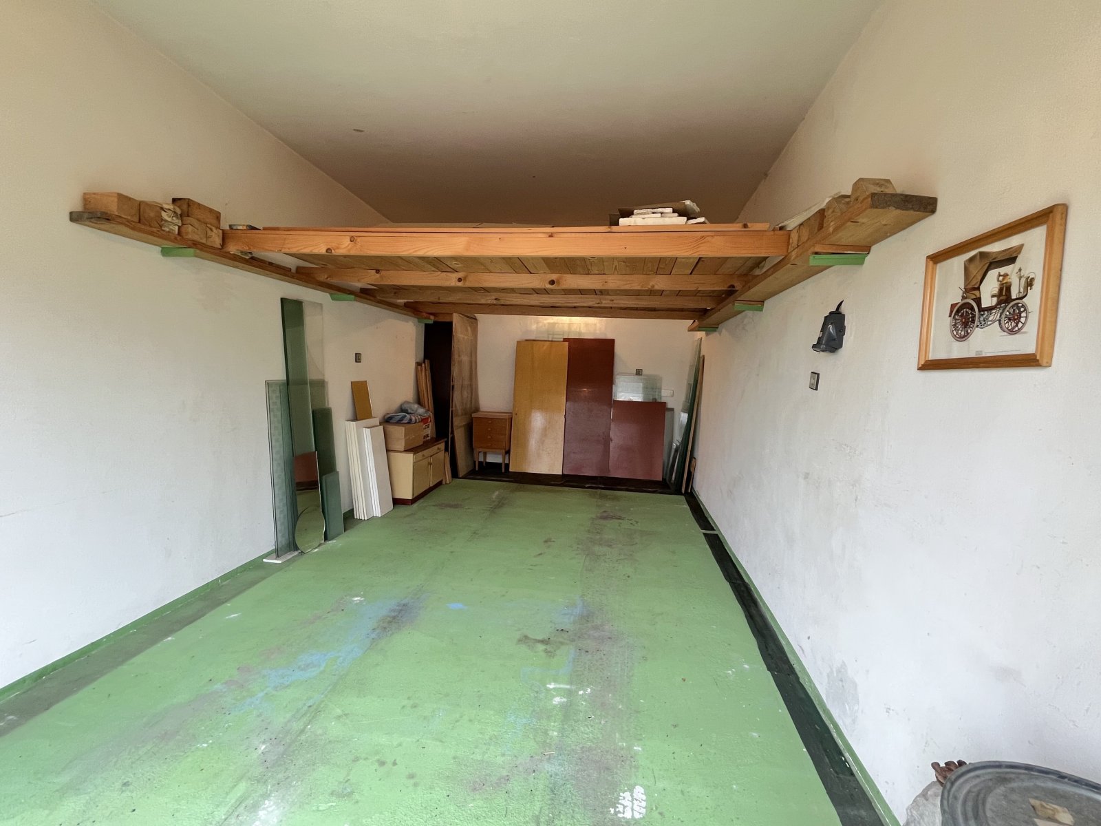 Jedná se o jednopodlažní řadovou garáž, která slouží pro parkování jednoho osobního automobilu. Stavba je založena na betonových základech. Svislé konstrukce jsou zděné, střecha je rovná krytá asfaltovými pásy ve výborném stavu. Před cca 4 lety položená nová IPA na střechu . Majitel si nechal zhotovit dřevěnou trámovou konstrukci na uložení věcí pod stropem (možno odstranit). Fasádní omítka je břízolitová, podlaha je betonová ošetřena nátěrem, vrata garáže jsou dvoukřídlá . Garáž je napojena na elektro 230V, 380V.