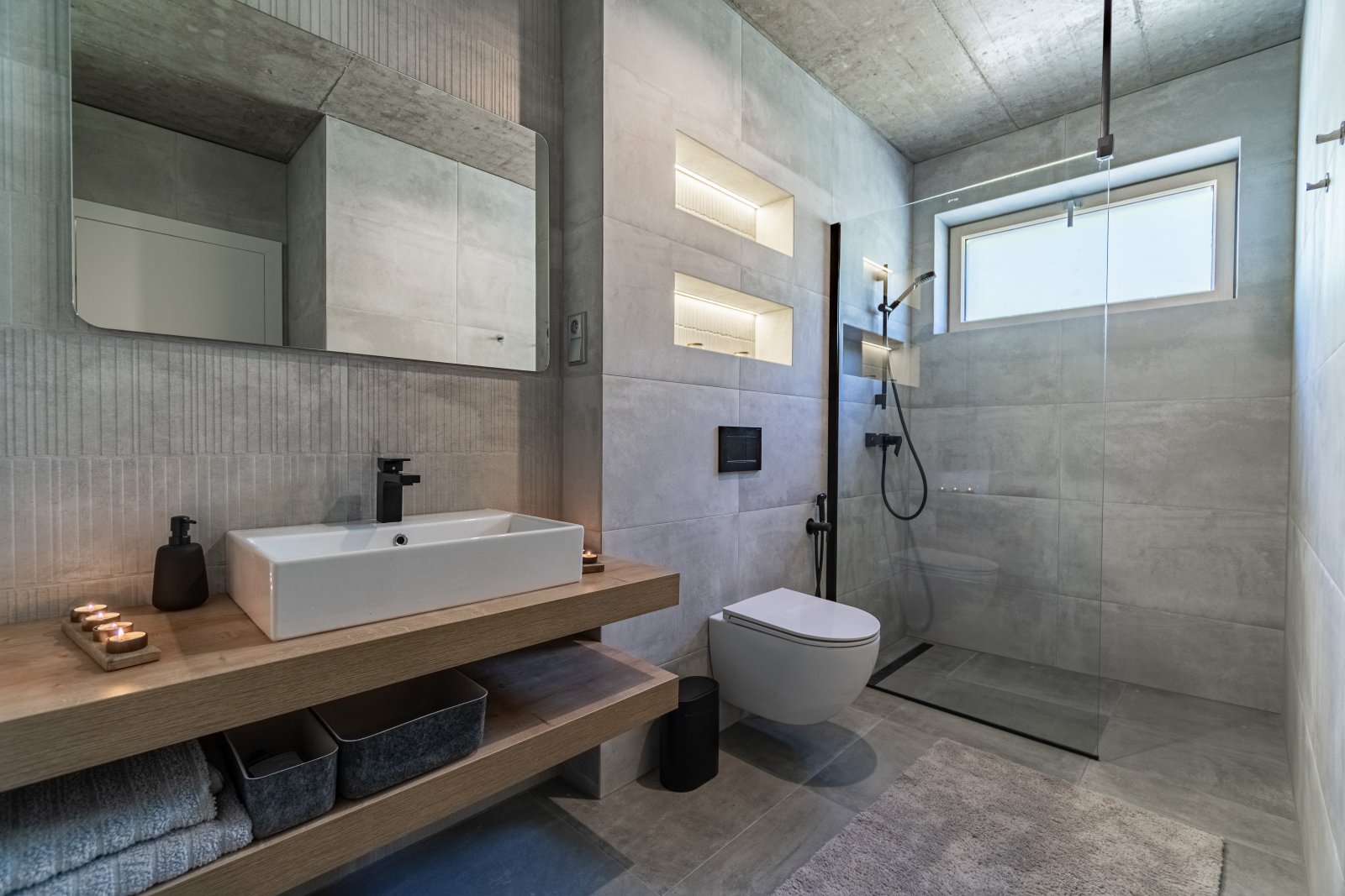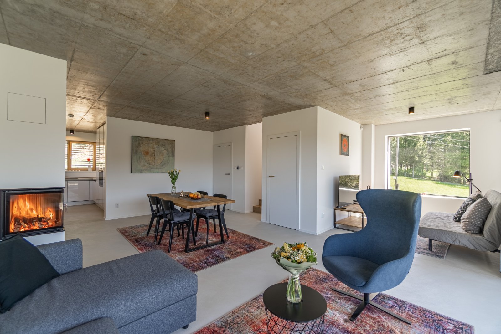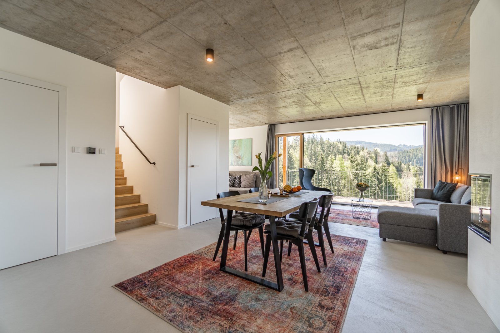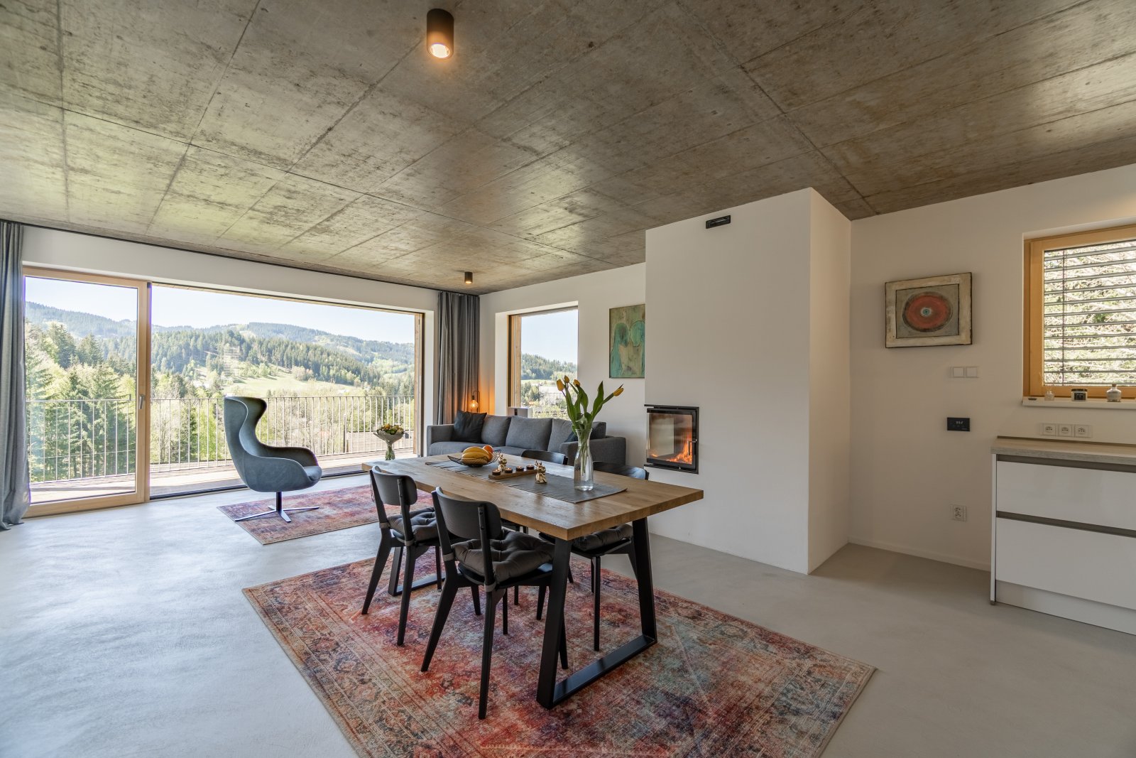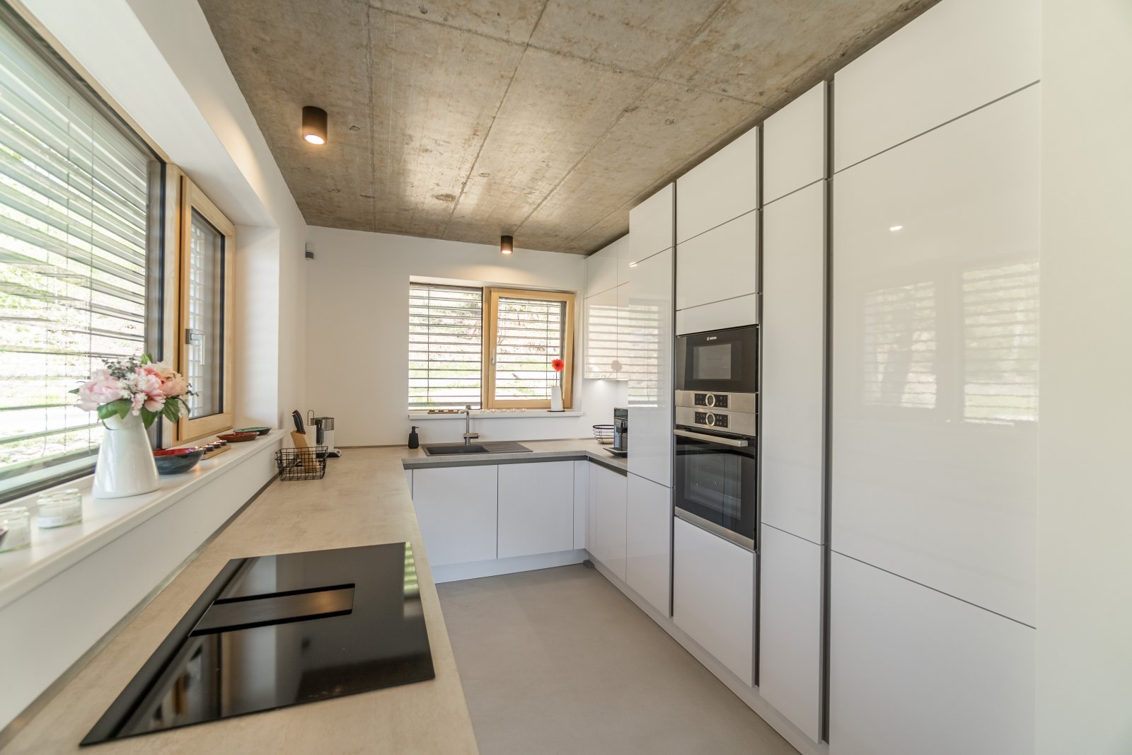 Přízemí tvoří velkoryse pojatý obytný prostor s kuchyní o ploše téměř 53 m2, kde se kombinuje moderní design s praktičností. V přízemí se dále nachází zádveří a koupelna se sprchovým koutem. Hlavní obytný prostor tvoří světlý obývací pokoj s velkoformátovými fixními okny, které nabízí panoramatické dechberoucí výhledy do krajiny a na blízké vrcholky hor, přinášející přírodu přímo do vašeho obývacího pokoje. Na něj navazuje moderní kuchyně vybavená s důrazem na detail a také s nádhernými výhledy do okolí.