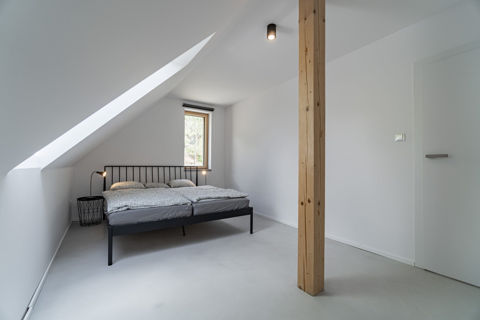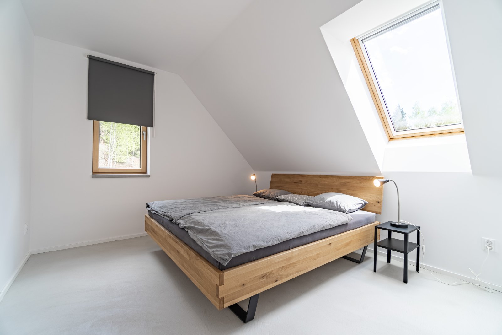 Horní patro disponuje třemi prostornými a světlými ložnicemi, šatnou a druhou luxusní koupelnou s vanou a sprchovým koutem. Všechny ložnice i koupelna mají opět úžasné výhledy do okolí. Nad patrem se nachází podkrovní úložné prostory, které jsou přístupné přes skládací půdní schody.