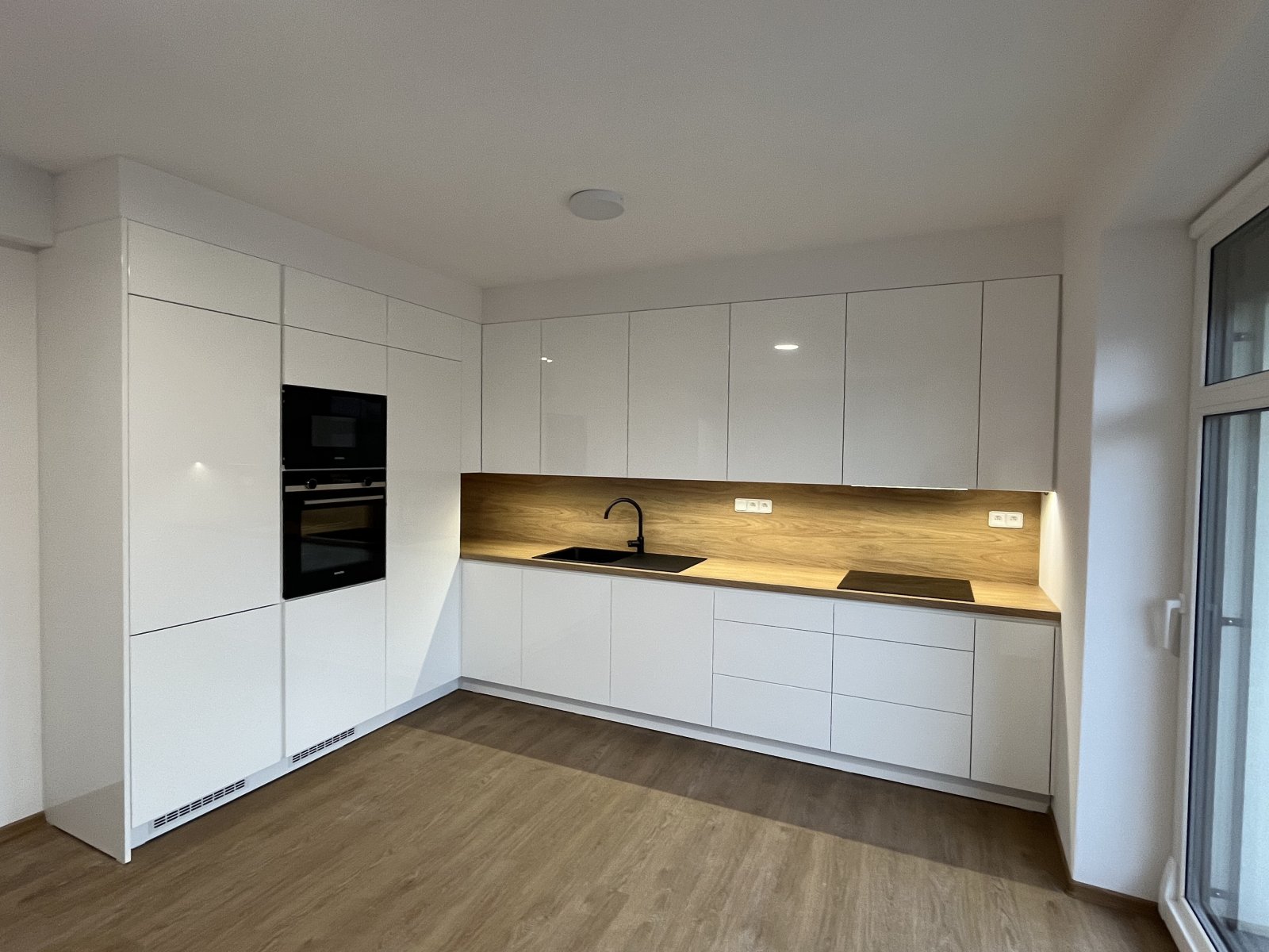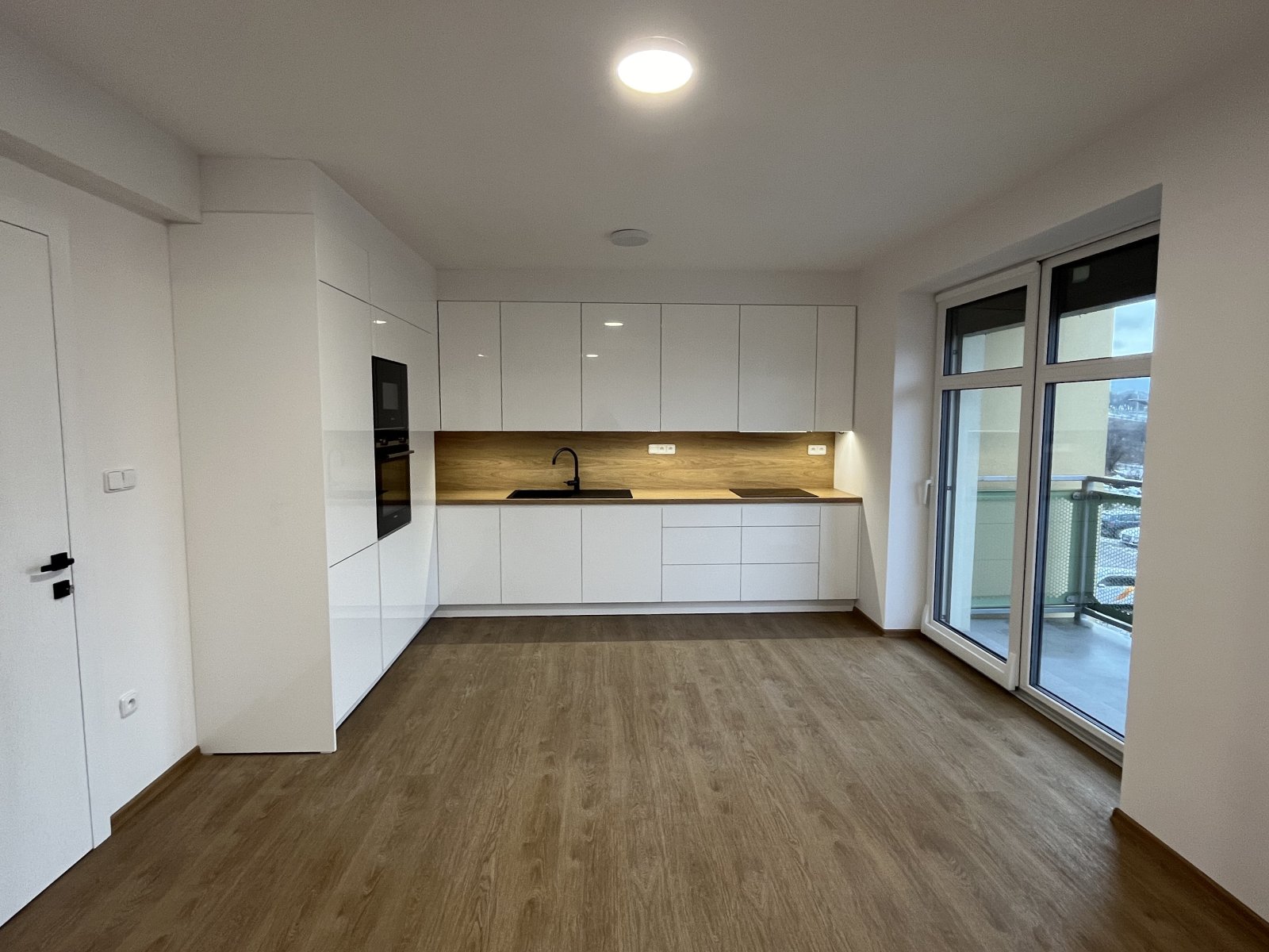 Do bytu se vchází přes zádveří, kde je prostor pro skříň a botník. Dále je zde prostorná chodba ze které se vstupuje vpravo do kuchyně a obývacího pokoje a vlevo do ložnice, pracovny a dětského pokoje, které jsou průchozí. Chodba tvoří střed bytu. U ložnice je vstup na balkón orientovaný na východní stranu. Dále se z chodby dostaneme také do technické místnosti a koupelny. Hlavní obytný prostor tvoří světlý obývací pokoj s velkoformátovými okny. Na něj navazuje moderní kuchyně s kuchyňskou linkou na míru, vestavěnými spotřebiči Siemens (sklokeramická indukční varná deska, digestoř, horkovzdušná trouba, myčka, vestavěná lednice). Z kuchyně vcházíme na balkón s výhledem do zeleně. Dále je zde luxusní koupelna se sprchovým koutem a WC.