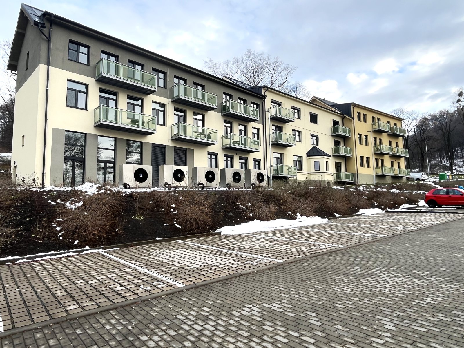 Velkou výhodou jsou vyhrazené 2x parkovací místa přímo v areálu – komfort a bezpečí máte vždy zajištěno. Závora na dálkové ovládání pro vjezd. Celý komplex je obklopen zelení, díky čemuž zde najdete dostatek klidu a soukromí, přestože se nacházíte jen kousek od centra města.